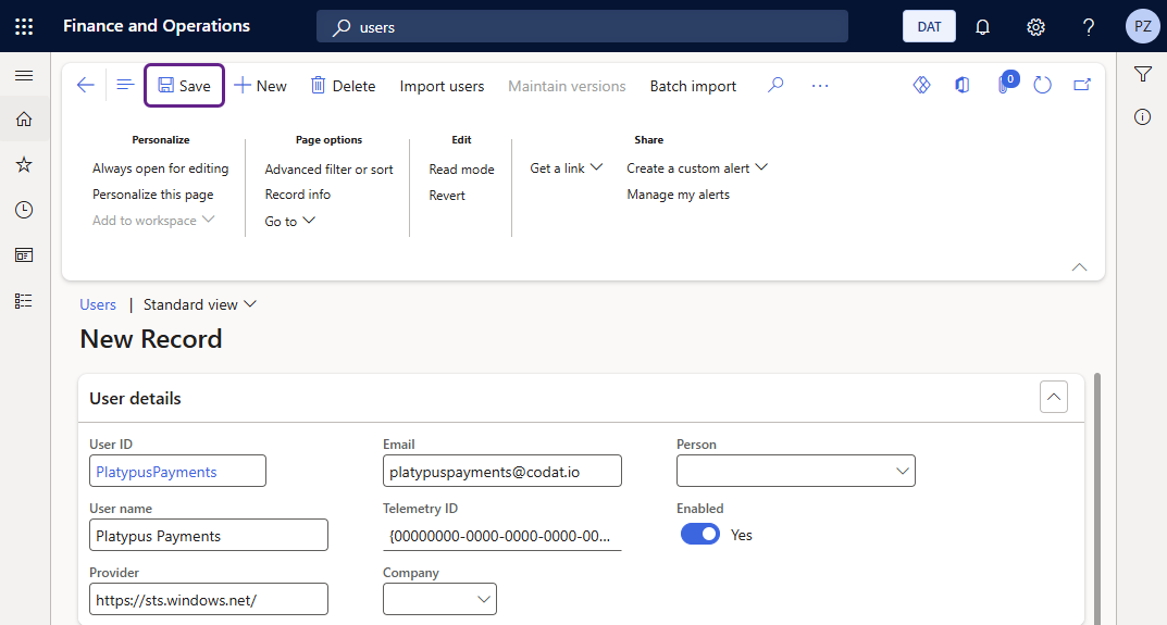 To create a new user, complete the following steps in Microsoft Dynamics 365 F&O: