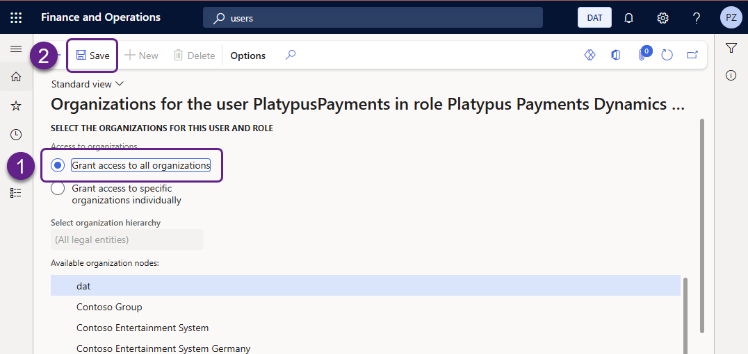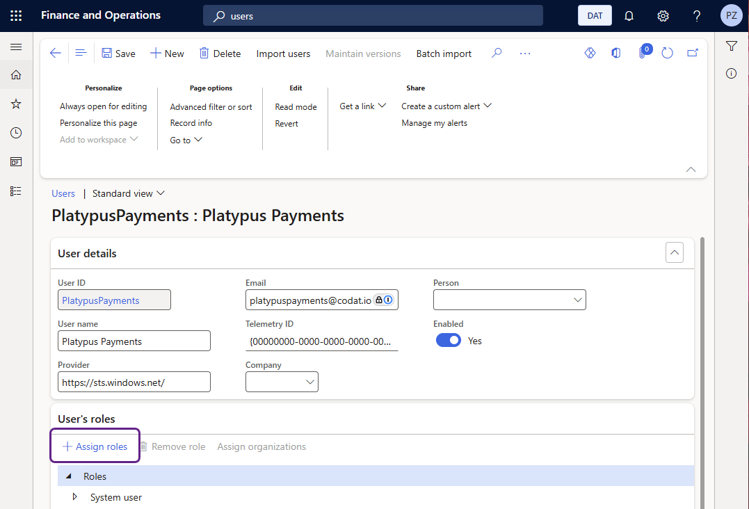 Continue with the following steps in Microsoft Dynamics 365 F&O to assign the role you previously created to the new user: