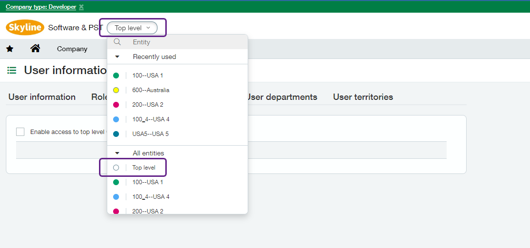 To navigate to the top-level entity, click on the entity dropdown next to your organization's name and logo at the top of the page, click All entities, then select the Top level radiobutton. The page will refresh to reflect the new selection.